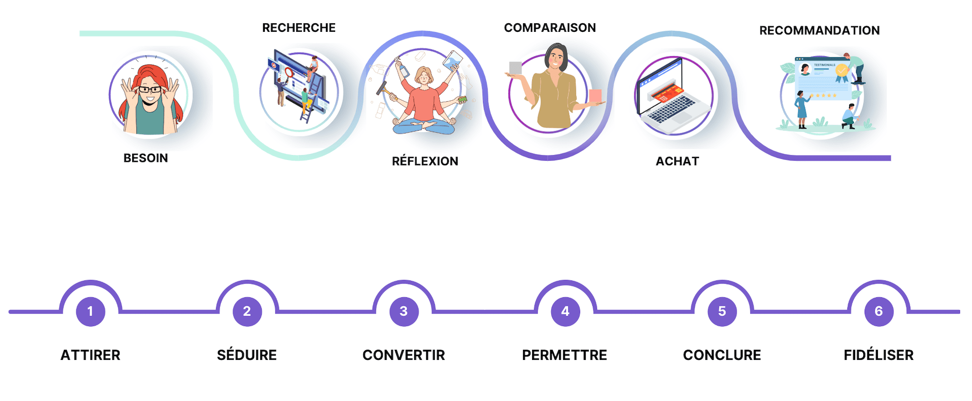 - Définir le buyer journey (c’est à dire le comportement de l’utilisateur entre la phase de découverte du besoin et la phase d’achat),